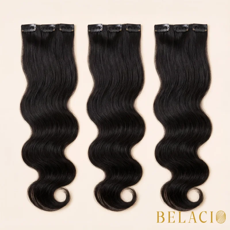 Belacio Soft Wavy Clip-In Hair 1B ofrece cabello vietnamita 100% humano con textura ondulada suave, brindando transformación nivel salón a través de sistema clip instalación instantánea.
